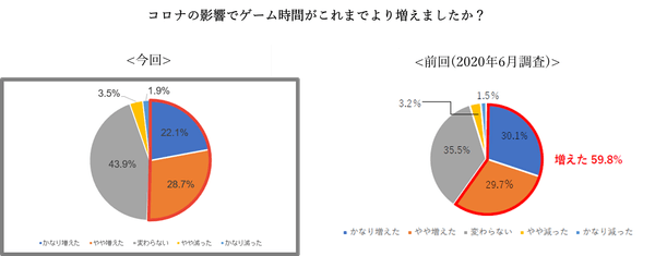 前回調査では「ゲーム時間が増えた人」が59.8%だったのに対し、今回調査は50.8%と前回に比べてゲーム時間の増加は緩やかになっているものの、半数が増加している実態。