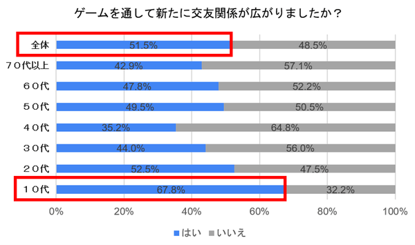 特に10代では7割(67.8%)と顕著で、ゲームプレイ時間の増加とともに交友関係が広がる傾向。
