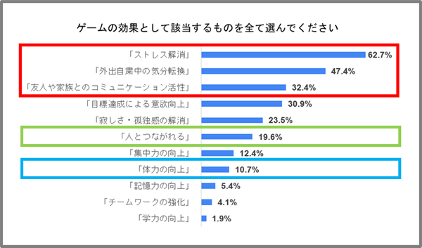 3.ゲームの効果ベスト3は「ストレス解消(62.7%)」「外出自粛中の気分転換(47.4 %)」「友人・家族とのコミュニケーション活性(32.4%)」