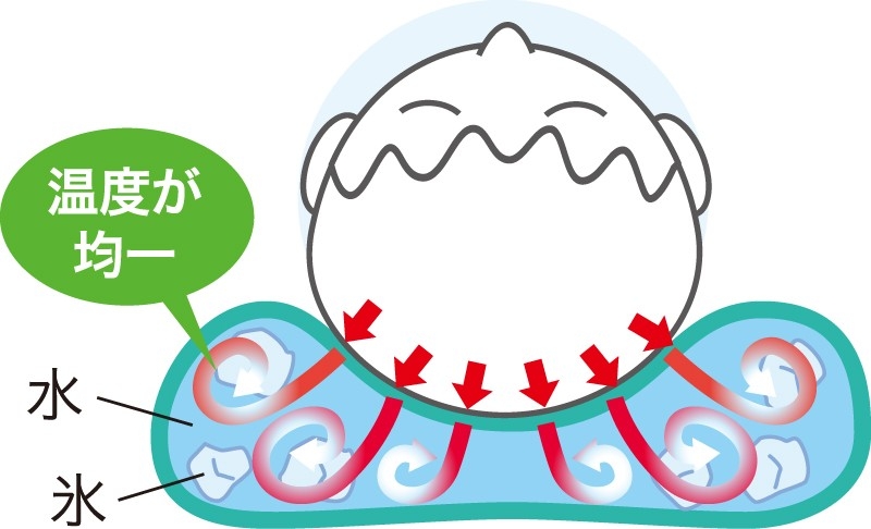 ■快眠のために重要な枕選び。水枕は水と氷の量で、好みや季節に合わせた温度調節や、首の高さ調節が簡単にできます。また冷却タイプの枕のように使い始めのカチカチ感がなく、頭の形にやさしくフィットします。