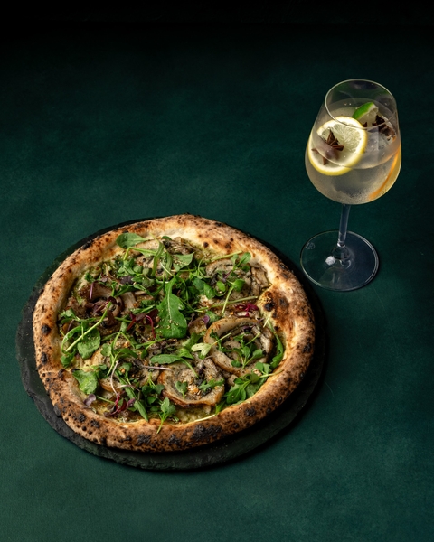 よもぎを練り込んだ自家製ポルケッタに、大和たちばなと森のハーブソルトをひと振り。日本の山風を思わせる、爽やかで力強い味わいの一枚です。