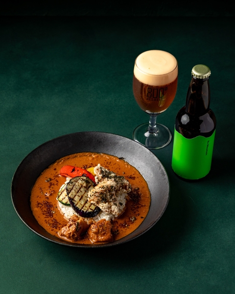 マーガオの実がふわりと香る、爽やかなバターチキン。隠し味にダンデライオン・チョコレートのチョコレートを使い、スパイスの辛味との絶妙なバランスに。クロモジのグリルチキンを添えて。