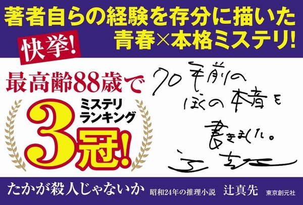 ドラマ、アニメ、特撮、ミステリ……多くの業界に影響を与え続けるレジェンド、辻真先が自身の体験を元に描いた「青春×本格ミステリ」『たかが殺人じゃないか』で史上最高齢のミステリランキング第1位を獲得。ミステリランキング3冠を達成しました!