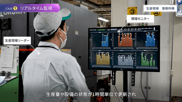 横須賀事業所内の生産ライン横のモニターで、生産計画と実績の差異や設備停止情報、単位時間あたりの生産量などを即座に確認できる仕組みを構築。これにより異常発見から対応までの時間が短縮され、生産管理の効率化と安定稼働が実現しました。