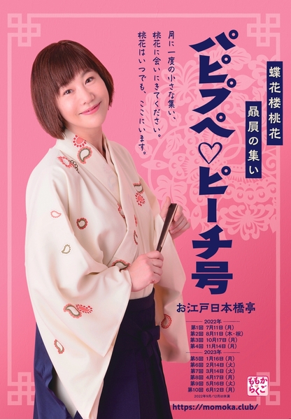 桃花らくご制作委員会企画制作、蝶花楼桃花 贔屓の集い「パピプペ♡ピーチ号」が2022年7月11日(月)から2023年6月12日(月)まで、お江戸日本橋亭(東京都中央区)にて全10回開催されます。6月28日(火)にはプレビュー公演として第0回が開催され、満員札止めの盛況となりました。