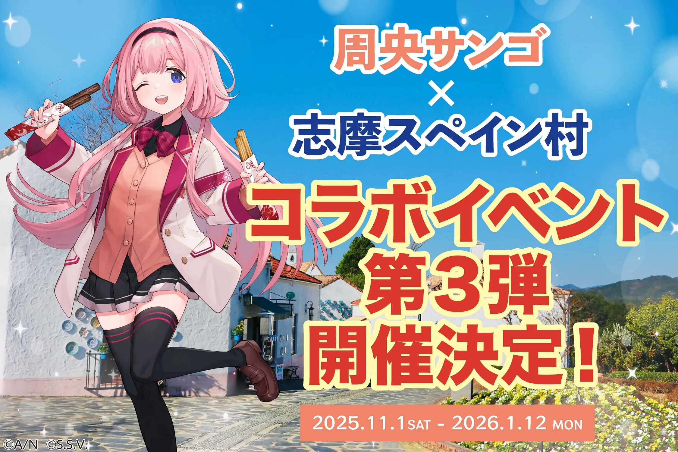 志摩スペイン村では、2025年11月1日(土)~2026年1月12日(月・祝)の73日間、ANYCOLOR株式会社が運営する「にじさんじ」所属のバーチャルライバー「周央サンゴ」(愛称ンゴちゃん)とのコラボイベントを開催することが決定しました。本イベントでは、ンゴちゃんとゆかりのあるライバーとともに、周遊ラリーやコラボメニュー、コラボグッズの販売、フォトスポットの設置など、ここでしかできない特別な体験をお届けします。詳細は決定次第、改めてお知らせします。