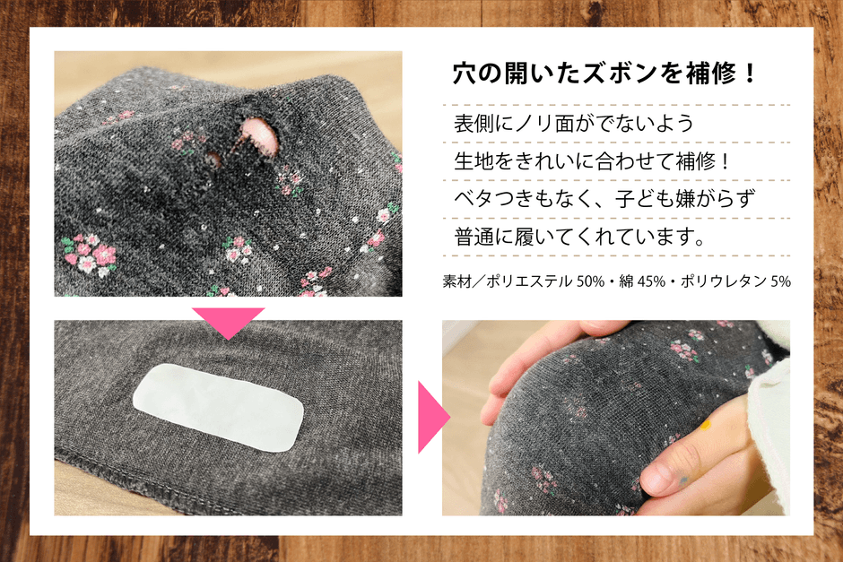 子どもが破いてしまったズボンをキレハシで補修。貼るときは、表側にノリ面がでないよう生地をきれいに合わせて、キレハシの角をはがれにくいように丸ーくカットして貼るとキレイに仕上がります。以前社内スタッフが薄ピンク色のズボンで試したところ、表側にシールの跡が出てきたそうなので、目立ちにくい色の衣類だと長く使えるようです。子どもに1日履かせた上で4回以上お洗濯しましたが、今のところ変化なく履けているそうです。
