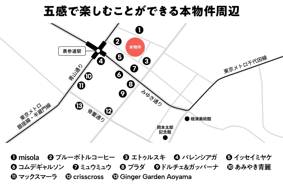 表参道付近は、「みゆき通り」や「骨董通り」と呼ばれる大通り沿いを中心に話題のカフェや高級レストラン、ハイブランドの旗艦店などが建ち並ぶ他、「根津美術館」や「岡本太郎記念館」などの文化施設も位置し、五感を刺激する"大人おしゃれな街"として賑わっています。