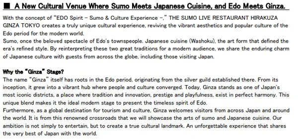 さらに、銀座は国内外の旅行者が訪れる世界的な観光・文化拠点です。ここから相撲や和食といった日本文化を世界へ発信することで、単なるエンタテインメントに留まらない、日本文化のランドマークとしての役割を担ってまいります。