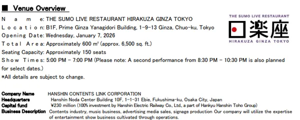 Hanshin Contents Link Corporation (Headquarters: Fukushima-ku, Osaka; President: Susumu Shimizu) has announced that the opening date for the inbound-focused sumo entertainment show restaurant in Ginza, Tokyo, “THE SUMO LIVE RESTAURANT HIRAKUZA GINZA TOKYO,” will be Wednesday, January 7, 2026.
