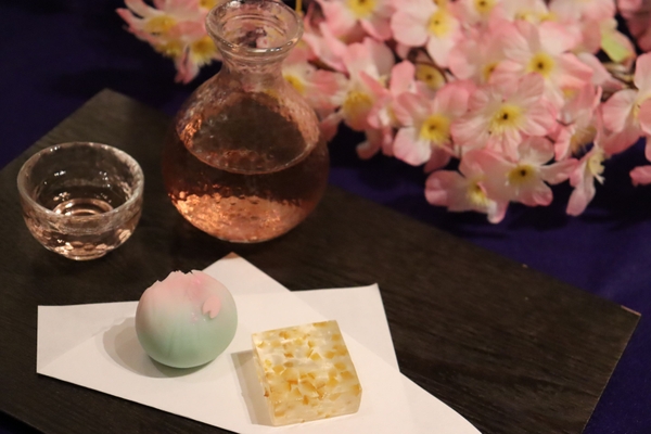 「夜桜人力車ライド」では、玉湯川沿いのお花見スポットでお楽しみいただける「夜桜花見酒セット」を提供します。出雲国風土記の中で島根が発祥とされる日本酒を、松江の老舗和菓子屋である彩雲堂の職人が実際に試飲し、相性の良い朝汐餡を使った練り切りと柚子の風味を活かした涼やかな錦玉の二種を作成しました。夕食後に丁度良い量の日本酒半合と、春をイメージした小ぶりの和菓子二種で、満開の夜桜を愛でながら川辺でほっと一息つくことができます。