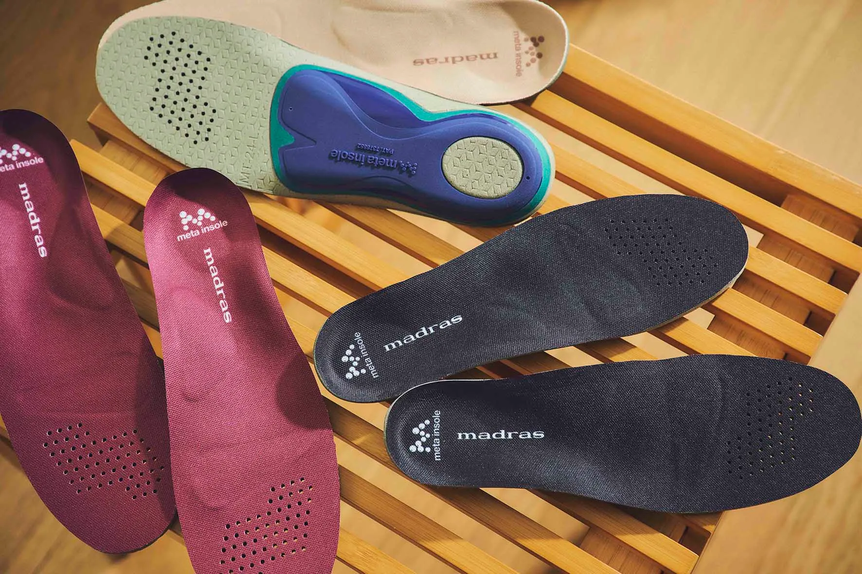 マドラスが独自に開発し特許を取得したmetaインソール(R)は、伸張性に優れた医療用の超柔軟ゲルが足裏を支えることで衝撃を分散して疲労を軽減します。さらに足裏を刺激する指圧効果によって健康歩行を促進する、革新的なインソールです。