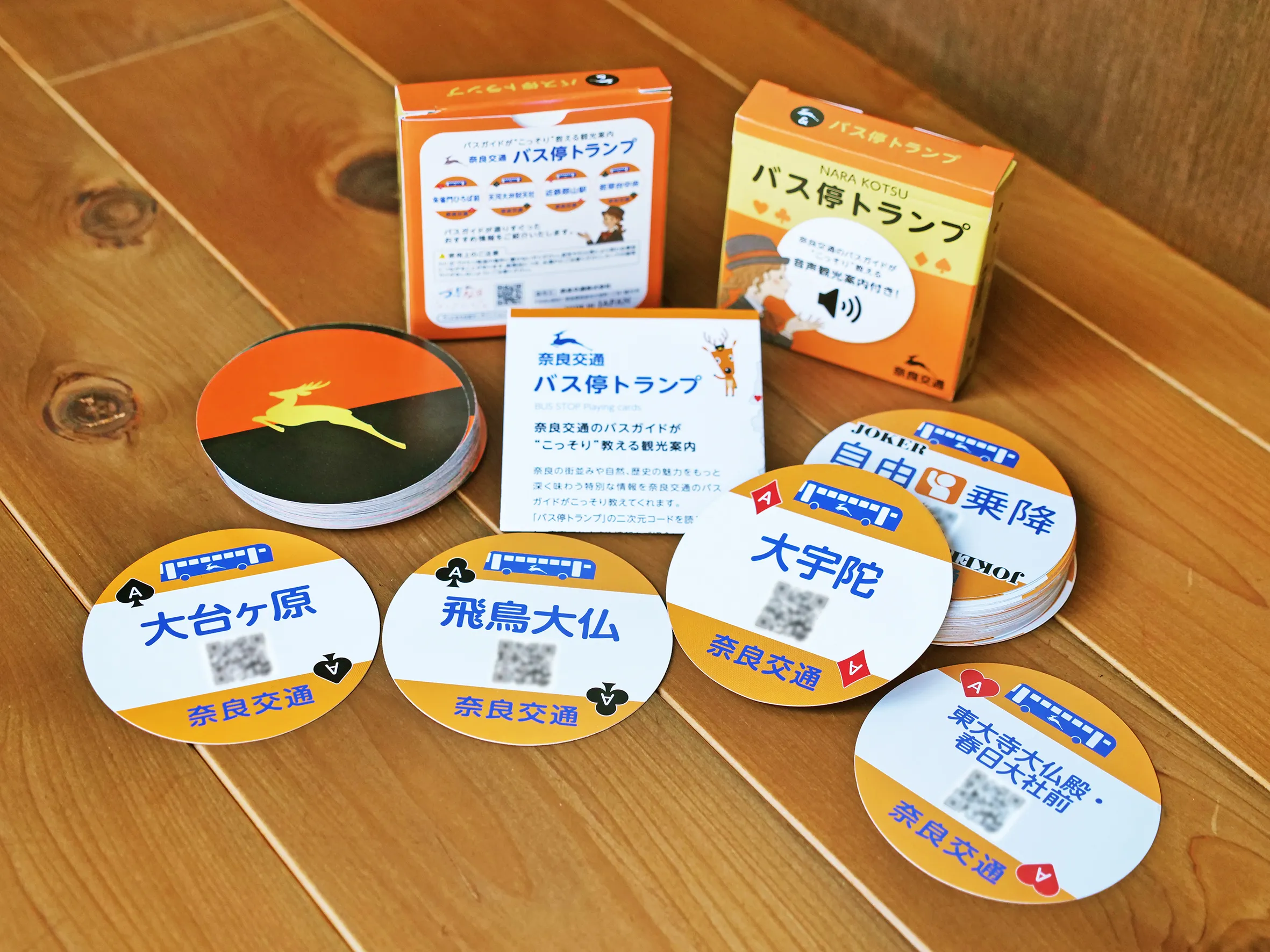 本商品は、「奈良交通のバスガイドが“こっそり”教える観光案内」をコンセプトとして、奈良の観光地にあるバス停52箇所の名前を集めたトランプです。奈良交通バスガイドのお勧め情報を集結した特別な観光案内を、トランプ図柄の中のQRコードから音声で聞くことができます。