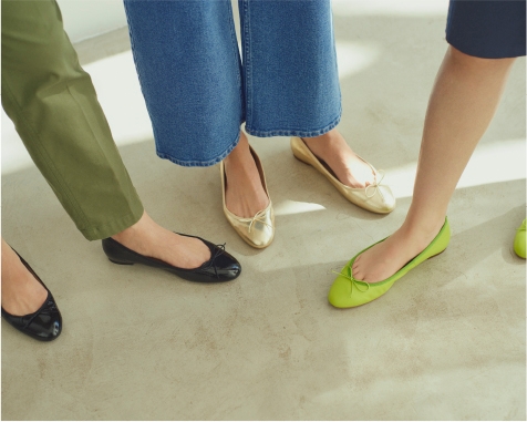 足の指股がのぞく、甲浅のバレエシューズは脚長効果絶大。グレーのレース以外は、足馴染みが良く、発色も美しい本革をセレクト。中敷きには制菌・抗菌・防臭加工が施されたフェイクレザーを採用。通気性にも優れています。