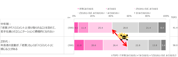 調査結果によると、「老害」や「ハラスメント」と受け取られることを恐れて、若手社員とのコミュニケーションに積極的になれないと回答した中年層は4割でした。一方で、年長者の言動が「老害」もしくは「ハラスメント」に感じることがあると回答したZ世代は6割近くに達しました。