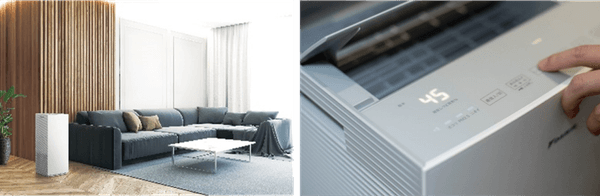 室内の空気質への関心が高まる中、空気清浄機にはこれまで以上に設置のしやすさや生活の邪魔にならない運転音などが求められています。本商品では、本体の構造・部品の配置を新規に見直すことで、設置面積を約13%低減。また、ワイドな吹出口の採用と送風ファンをフィルター下部に配置することによる防音効果で、人が感じる運転音(SONE値)を約30%低減しています。
