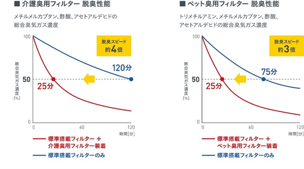 ※測定結果を元に12畳相当での効果に換算。【試験方法】JACA(日本空気清浄協会)試験臭を参考にそれぞれのニオイ成分を選定。各ニオイ成分の単体ガスを1㎥ボックスに投入して脱臭フィルター吸着性能を測定(測定機関:大和サービス株式会社)。【試験機】MCK70Y