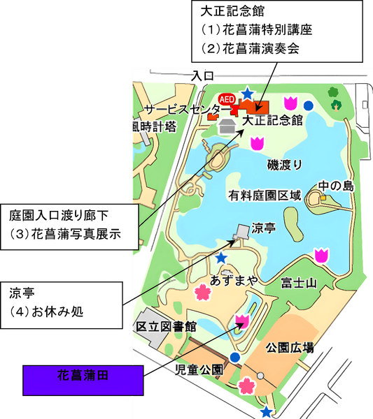 深川の名園・清澄庭園では、江戸系ハナショウブの群生の美と、白、ピンク、青、紫、複色等の多彩な花色をお楽しみいただくことができ、見ごろの時期に合わせて講演会や演奏会、お休み処などのイベントも行います。