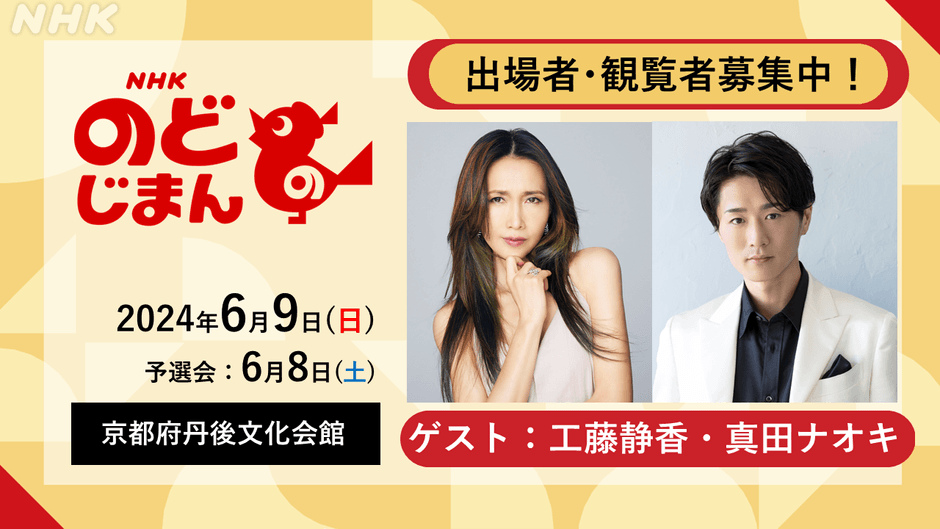 6月9日(日)に京都府京丹後市より生放送でお送りする「NHKのど自慢」に真田ナオキがゲストで出演!
