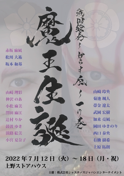 ジャスティスジャパンエンターテイメント(東京都港区、代表:松島 みどり)主催、戦国絵巻~からす瓜~一の巻『魔王生誕』が2022年7月12日 (火) ~2022年7月18日 (月・祝)に上野ストアハウス(東京都台東区)にて上演されます。チケットはカンフェティ(運営:ロングランプランニング株式会社、東京都新宿区、代表取締役:榑松 大剛)にて6月1日(水)12:00より発売開始です。