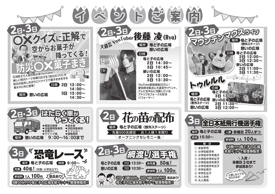 はたらく車、餅まき、菓子まき、全日本紙飛行機選手権など盛りだくさんです!