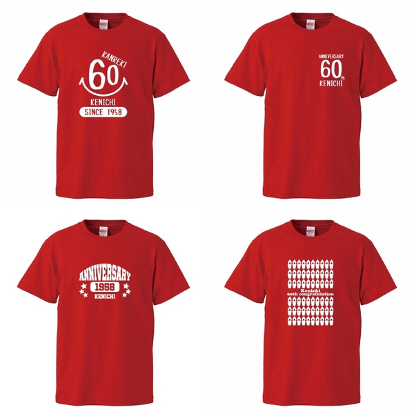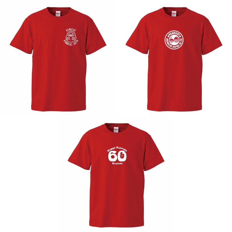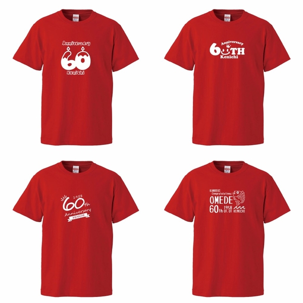 赤いTシャツに「60」をモチーフとした特別なデザインで、還暦の喜びを形にします。名入れ対応で、より特別な一枚をお作りいただけます。