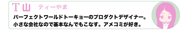 今日のインタビュアーはパーフェクトワールドトーキョーの商品開発デザイナー、T山です。