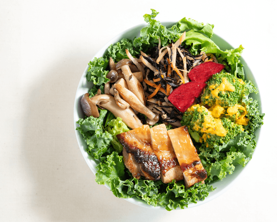 ヨーグルトを使用した特製タレに漬け込んだ照り焼きチキンをメインに、塩麹とりんご酢で仕上げた3種のきのこのマリネ、ひじきを入れた塩きんぴら、ブロッコリーとかぼちゃのサラダ、3種のデリをトッピング。1ボウルでひとくちごとに異なるデリのうま味が広がり、さまざまな味の層を楽しめる贅沢な和風サラダです。