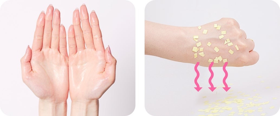 サラサラとした軽い感触が特徴で、肌によくなじみます。オイル塗布後しばらくすると紙吹雪もくっつかなくなります。