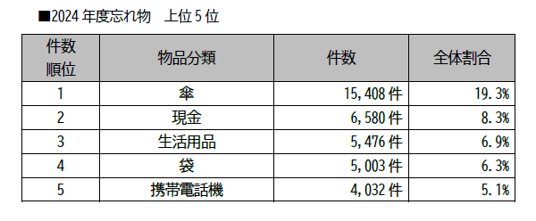 2.忘れ物ランキングでは、傘が最も多く15,408本(2023年度比 約2.7%増)で、1日あたりでは約42本となり、忘れ物全体の約19.3%を占めました。なお、暦の上では入梅を迎え、6月ごろは傘の忘れ物が増える傾向にあります。