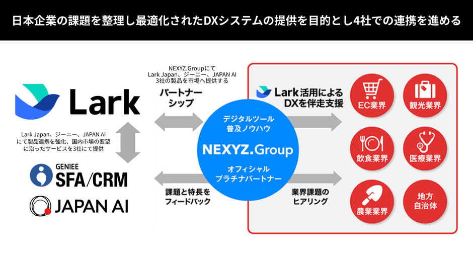 NEXYZ.Groupの拡販力、Lark Japanのグローバルな技術力、ジーニー・JAPAN AIの国内企業に特化した開発力・販売力を活かしシステム連携および営業連携を強化することで、日本企業のAX及びDXを包括的に支援してまいります。