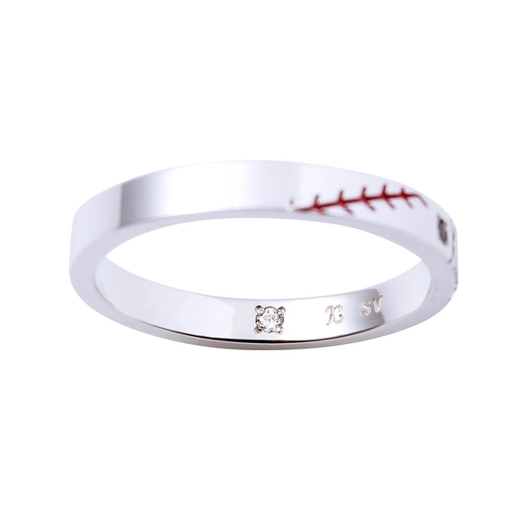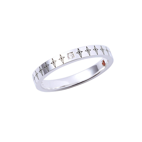 シンプルなストレートフォルムにヘアピンとボディステッチを取り込み、ブラックのストーンをセット。リングの内側には過去の什造をイメージしたホワイトのストーンを留めることで、篠原特等の教えを忘れない姿を表現しました。