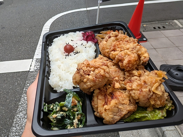からあげ弁当は、大ぶりな唐揚げがたっぷりと入っており、蓋が閉まらないほどのボリューム。これで600円と、非常にコストパフォーマンスが高い一品です。