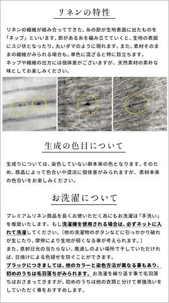 プレミアムリネンの風合いを保つため、やさしく「手洗い」がおすすめです。洗濯機をご使用の際は、ネットに入れてやさしく洗ってください。(摩擦や引っかかりを避け、生地の傷みを防ぎます。)乾燥は「直射日光を避け、風通しの良い場所」で。日焼けによる退色を防ぎます。特に「ブラック」は染色の特性上、最初の数回は毛羽落ちが発生することがあります。他の衣類とは分けて、単独でのお洗濯をお願いいたします。
