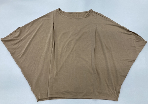 冬は重ね着ができますが、夏はどうしても1枚の服で体型をカバーするのは難しいです。そこで、体型をデザインでカバーできればと考え、五角形のTシャツに行き着きました。軽くやわらかい素材を活かし、気になる二の腕やウエスト周りなどのポイントを五角形で拾い、ナチュラルに体を包むデザインです。