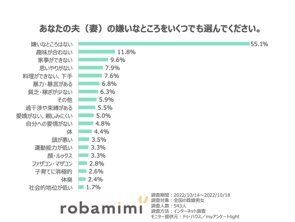 夫・妻の嫌いなところは「ない」が過半数で第1位に