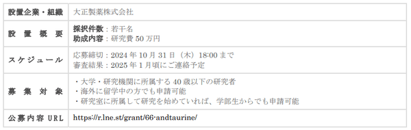 大正製薬株式会社[本社:東京都豊島区 社長:上原 茂](以下、当社)は、タウリン研究の発展と若手研究者の支援を目的として、第66回リバネス研究費※「&タウリン賞」の公募を開始いたしました。