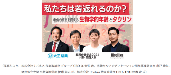 本公募開始に先立ち、2024年8月31日に開催された「超異分野学会2024 大阪・関西大会」(株式会社リバネス主催)にて、パネルディスカッション「私たちは若返れるのか?-老化の概念を変える生物学的年齢とタウリン―」を、遺伝子の仕組みを分析するエピゲノム解析のリーディングカンパニーである株式会社Rhelixa(レリクサ)と共催しました。株式会社リバネス 代表取締役 グループCEO 丸 幸弘 氏がモデレーターを務め、福井県立大学 生物資源学部 伊藤 崇志 氏、株式会社Rhelixa 代表取締役 CEO / CTO仲木 竜 氏、当社セルフメディケーション開発薬理研究室の森戸 暁久が登壇し、タウリンの抗老化に関する研究の広がりや若返るための生活習慣について議論を展開しました。