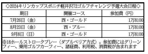 爽やかなリゾートゴルフが満喫できる軽井沢72ゴルフで「2024 キリンカップ スポニチ軽井沢72ゴルフチャレンジ」を、別表の通り開催します。各予選大会の上位26人は、日本女子プロゴルフツアー「NEC軽井沢72ゴルフトーナメント」で知られる北コースでの決勝大会(10月20日開催)に出場できます。