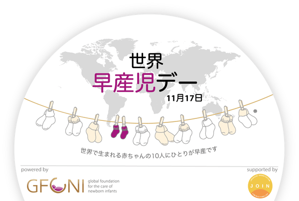 11月17日の世界早産児デーは、ちいさく早く生まれた赤ちゃんとご家族が抱える課題や負担に対する意識を高めるため、2008年にヨーロッパNICU家族会(EFCNI)および提携している家族会によって制定された記念日です。靴下が並ぶイラストは、世界早産児デーのシンボル。9足の靴下の間にある1足の紫色の小さな靴下は、世界中で10人に1人の赤ちゃんが早産で生まれていることを象徴しています。