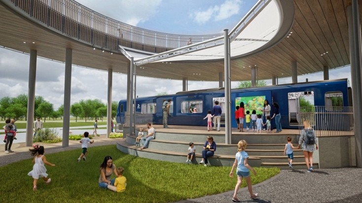 SOTETSU PARKには、2026年春から営業運転を開始する新型車両「13000系」の実車を活用。横浜駅を起点に横浜中央部に向かう相鉄線沿線には、暮らしと調和した自然が広がっています。「安全×安心×エレガント×未来」をコンセプトに持つ同車両は、子どもたちを自然へとガイドする役割を担い、環境インフラである鉄道を中心にして街と人と生きものが共生する未来を表現します。