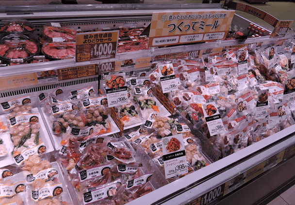 忙しいときにフライパン一つで簡単に1品が完成する冷凍のミールキットを取りそろえます。また、生野菜と肉を合わせたチルドタイプのミールキットもカメイドクロック店から新発売いたします。