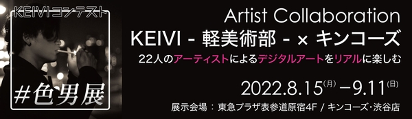 キンコーズ・ジャパン株式会社(本社:東京都港区、代表取締役社長:渡辺 浩基、以下 キンコーズ)は、インスタグラムでフォロワー13万人を超えるSNSアートキュレーションメディア「KEIVI-軽美術部(ケイビ)」が東急プラザ表参道原宿(東京都渋谷区)のデジタルアート専門のギャラリー「DiGARO(ディガロ)」で開催する「#色男展」とコラボレーションし、当社が運営するキンコーズ・渋谷店で2022年8月15日(月)~9月11日(日)の期間、SNSアーティストの作品を展示します。