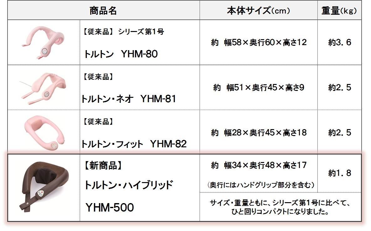 2014年4月4日 14:00株式会社山善(本社:大阪市西区/代表取締役:吉居 亨)/家庭機器事業部では、ハンドフリー・マッサージャー「TOLTON(トルトン)」シリーズの新商品として、“もみ”と“たたき”のマッサージが同時にできる『トルトン・ハイブリッド YHM-500』を発売いたしました。