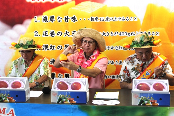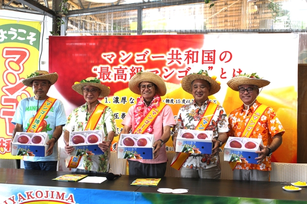 マンゴー共和国大統領には、嘉数登 宮古島市長(写真中央)が就任。マンゴー共和国・国民の三大義務を読み上げ、建国を宣言。「いただきマンゴー!」の合図で、おすすめの食べ方「マンゴー丸かじり」を披露した。