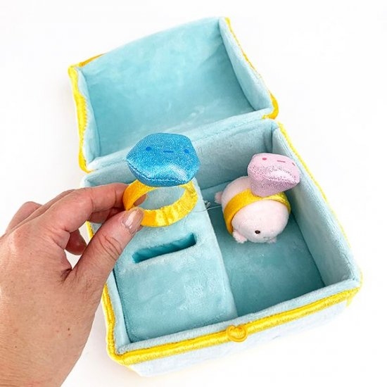 ピンク色の宝石のゆびわには、たぴおかがくっついています!どうやら、たぴおかは輪っかの部分にはまってしまったようです。たぴおかはちゃんとゆびわから取り外すことができるので、安心してください。他のすみっコのぬいぐるみに、ゆびわをはめても可愛いですね◎