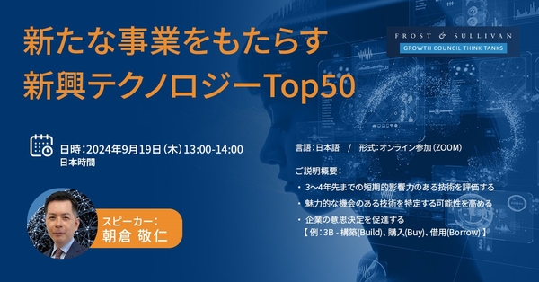 フロスト&サリバン ジャパンは、2024年9月19日(木)「新たな事業をもたらす新興テクノロジーTop50」と題し、ウェビナーを開催致します。(参加費用:無料)