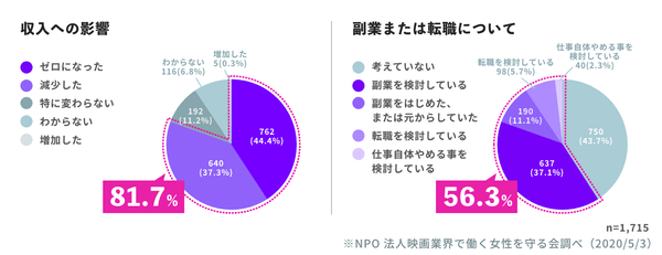2020年の映画の興行収入は前年比54.9%(一般社団法人日本映画製作者連盟調べ)と大打撃を受けており、芸能・映像業界で働くスタッフやキャストへ行った実態調査では、コロナの影響で81.7%の人が収入がゼロもしくは減少したと回答し、56.3%と半分以上の人が副業または転職について考えていると回答(NPO 法人映画業界で働く女性を守る会調べ)。インディーズ映画を上映するミニシアターに加え、制作に関わるスタッフやキャストの方々も危機的な状況となっております。