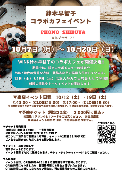 Winkの鈴木早智子のコラボカフェが、渋谷東急プラザの7階にあるレコードカフェ「PHONO SHIBUYA」で10月7日~20日の2週間限定で開催することが決定した。