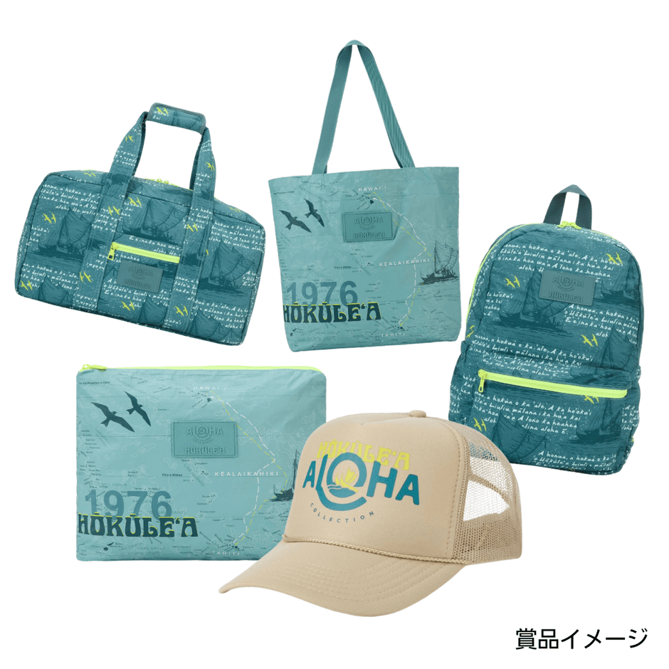 ホクレア 長編ドキュメンタリー映画『モアナヌイアケア』上映会にご来場いただいた方の中から、抽選で5名様に「ホクレア×アロハコレクション」コラボグッズをプレゼントいたします。ホクレア50周年を記念して、ハワイ生まれのブランド「アロハコレクション」とコラボして生まれた限定アイテムです。